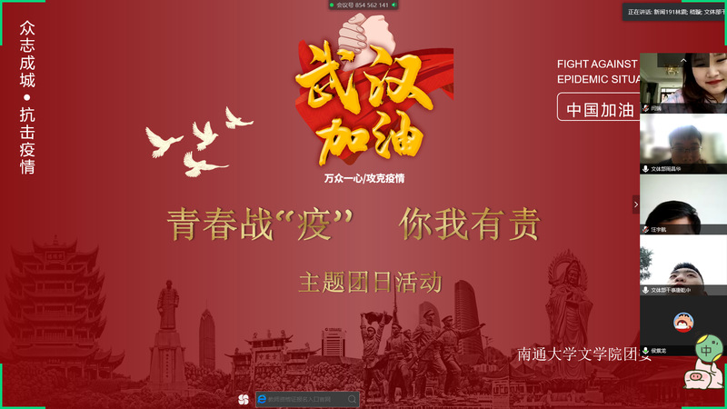 活动中,大家集体学习了习近平总书记关于疫情防控重要讲话精神,明确了战“疫”的重要性以及全国人民同舟共济,共同战“疫”的责任与使命;通过对《总书记指挥这场人民战役—凝心聚力》的观看与讨论,更坚定了战“疫”的决心与信心;观看战“疫”系列的优秀作品展示,表达了文苑学子对疫情严重地区的深深挂念以及对广大医务工作者和志愿者的敬仰之情。同学们还就开学前如何战“疫”各抒己见,畅所欲言,团日活动在热烈的讨论中圆满结束。