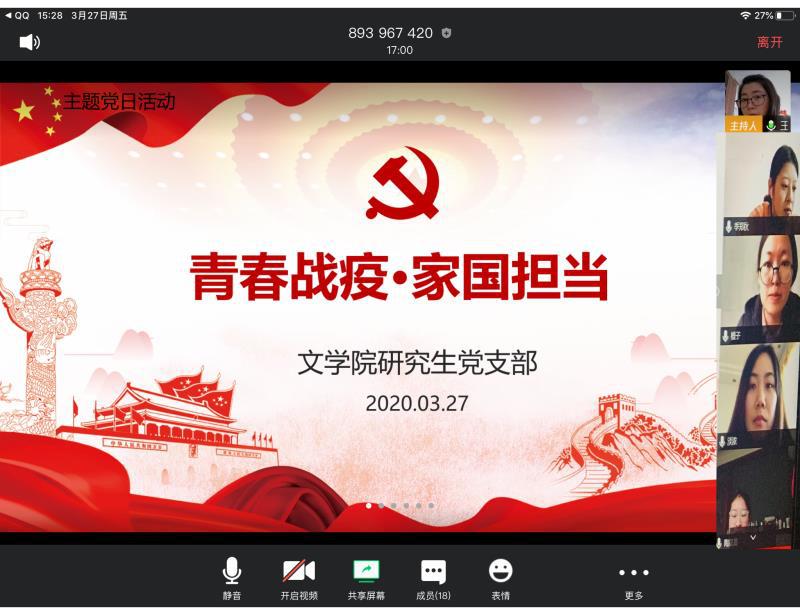 3月27日下午,6776永利集团研究生党支部利用微信与腾讯会议网络平台开展了一场特别的线上主题党日活动,活动以“青春战疫·家国担当”为主题,学习习近平总书记关于抗疫的相关指示,探讨当代大学生的家国使命担当。