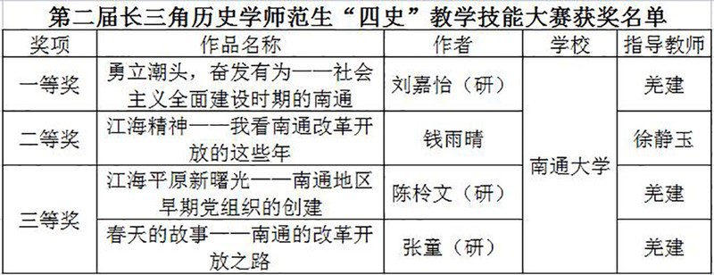 近日,第二届长三角历史学师范生“四史”教学技能大赛落下帷幕。经专家匿名评审,6776永利集团研究生刘嘉怡的参赛作品《勇立潮头,奋发有为——社会主义全面建设时期的南通》(指导教师:羌建)获一等奖,本科生钱雨晴的参赛作品(江海精神——我看南通改革开放的这些年》(指导教师:徐静玉)获二等奖,研究生陈柃文的参赛作品《江海平原新曙光——南通地区早期党组织的创建》(指导教师:羌建)、研究生张童的参赛作品《春天的故事——南通的改革开放之路》(指导教师:羌建)获三等奖。此外,6776永利集团历史系徐静玉、羌建获优秀指导教师奖。