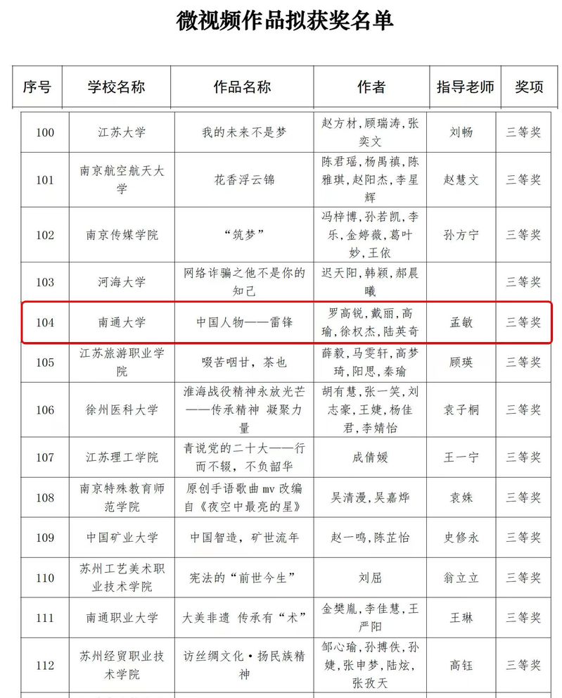 近日,江苏省委教育工委、江苏省教育厅公布了2023年江苏省大学生网络文化节和高校网络教育优秀作品推选展示活动遴选结果。经过高校申报、材料初审、专家评审,我院共三项作品在江苏省大学生网络文化节中取得佳绩,微视频作品《中国人物—雷锋》荣获微视频类三等奖,微电影作品《心镜》荣获微电影类三等奖,音频作品《陈情表》荣获音频作品类三等奖。