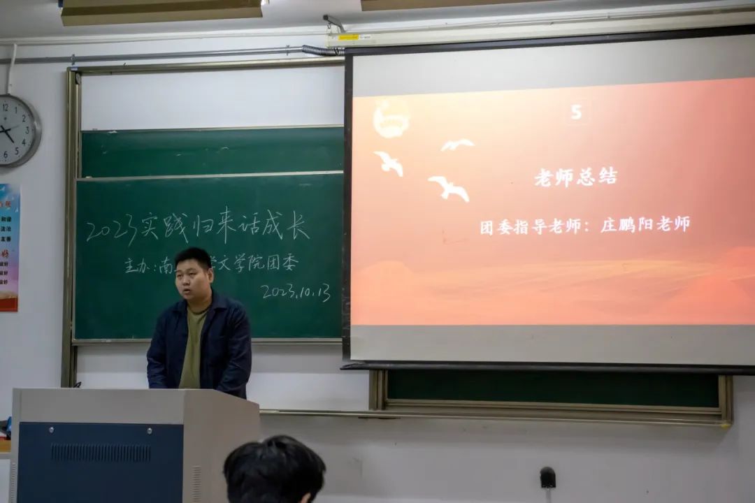 最后,社会实践小分队指导老师庄鹏阳就学院动员工作、活动开展情况、活动成果等方面进行了总结发言。庄老师充分肯定了各团队在暑期社会实践取得的丰富成就,向所有参与实践、作出艰苦努力的老师和同学们表示亲切的问候。同时,庄老师向在场的文苑2023级新生介绍了寒暑假社会实践要求,鼓励同学们积极参与暑期实践,锤炼品德修为,勇担社会责任,向学生们表达了到基层中去、到实践中去、到人民中去的殷切希望。