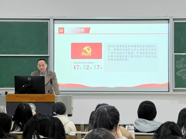 yl6776永利集团纪委副书记刘飞作了题为《划好纪律红线,积极向党组织靠拢》的讲座,刘教授主要从以下四个方面进行讲解:第一,党的纪律的基本内涵。第二,党纪处分规定的制定完善历程。第三,为什么要学习党的纪律。第四,新时代党的纪律的基本内容。刘飞重点强调大学生要在学习生活中自觉维护党的团结统一,划好纪律红线,要在政治、组织、廉洁、工作、群众、生活六个方面积极向党组织靠拢,自觉做共产主义远大理想的坚定信仰者和忠实践行者。